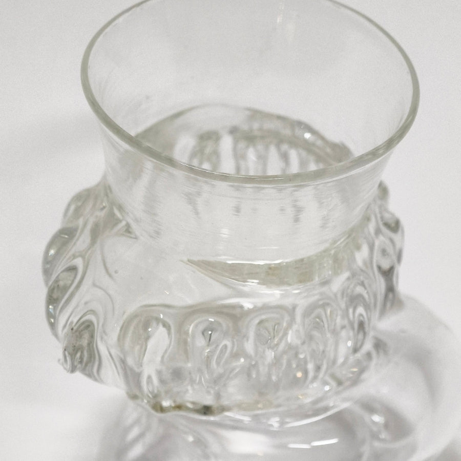 Influenced by medieval Waldglas techniques and forms, these loose, expressive glass vessels reveal bubbles, ripples and organic distortion within the luminous clear material. Their forms evoke sea shells, mythic objects, like artefacts from a mermaid’s table.