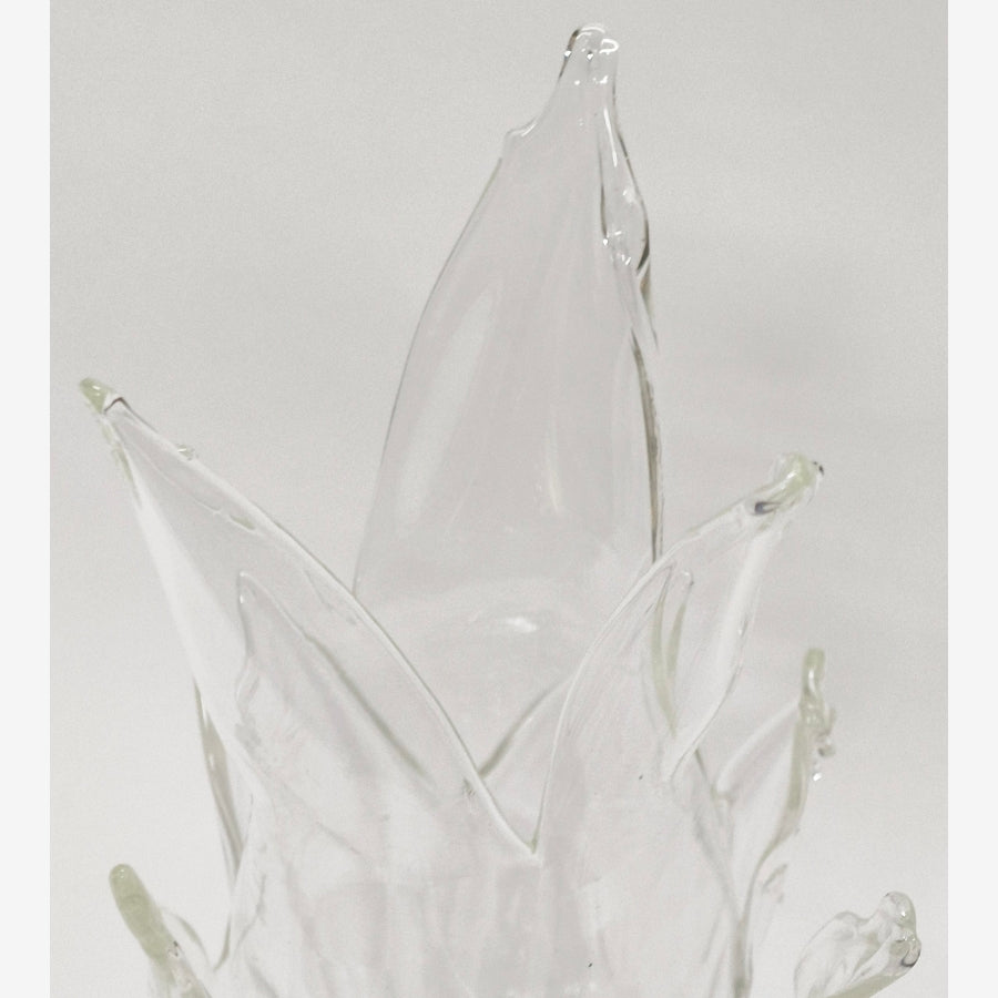 Influenced by medieval Waldglas techniques and forms, these loose, expressive glass vessels reveal bubbles, ripples and organic distortion within the luminous clear material. Their forms evoke sea shells, mythic objects, like artefacts from a mermaid’s table.