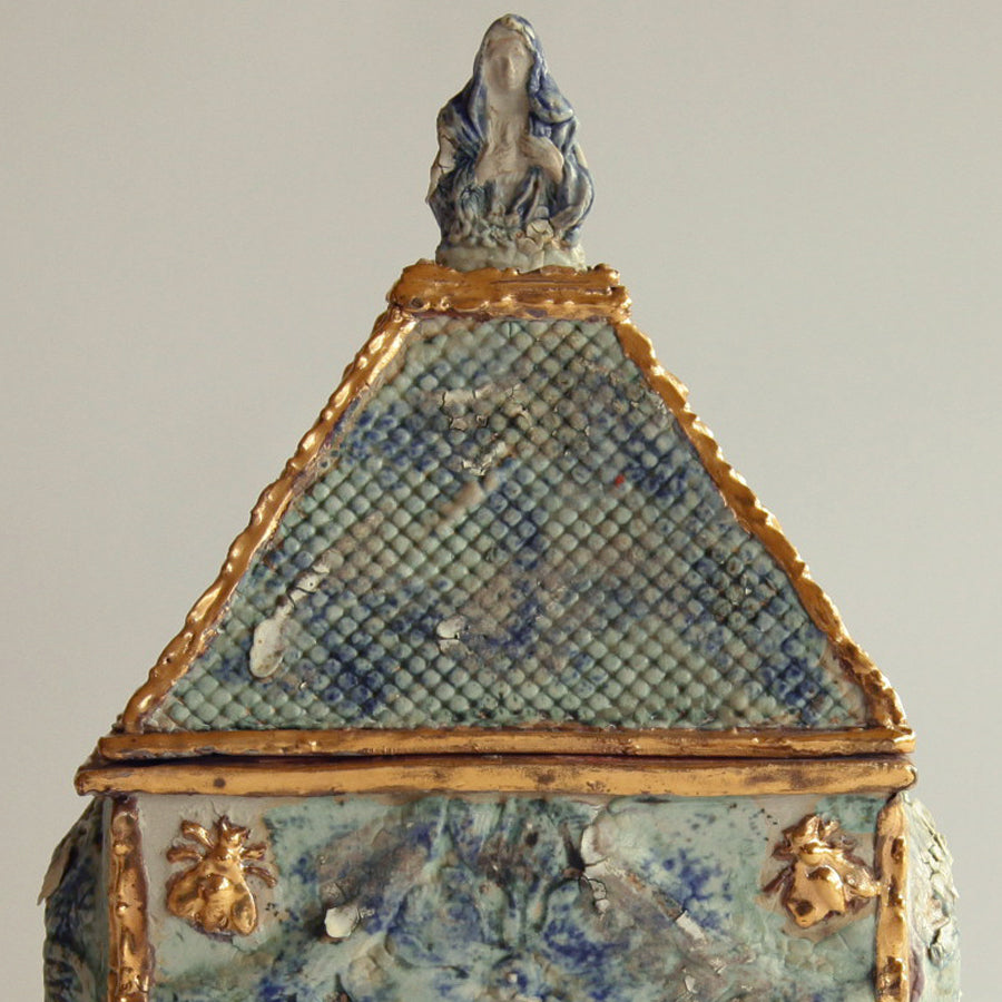 This Reliquary box expresses key aspects of John O’Loughlin’s ceramic practice. The pointed spire-like lid complete with Mother Mary, tops an architectural box form with press moulded surfaces accented with bees highlighted in metallic lustre. Delicate petals of engobe and subtle tones of blue and verdigris evoke something age worn and historic.